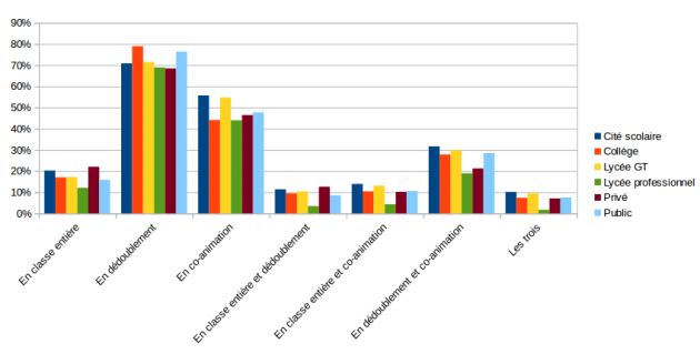Dans le panel, 944 professeurs documentalistes s'occupent de l'AP dans leur établissement. Si près d'un collègue sur cinq, parmi ceux-ci, travaille sur ce dispositif en classe entière, c'est loin d'être l'organisation la plus fréquente, avec surtout le dédoublement, notamment car ce peut être le seul moyen pour les professeurs documentalistes d'intervenir, légalement, avec la co-animation (Graphique 14). Notons tout de même des différences importantes entre public et privé, avec la classe entière plus fréquente dans le collège privé, le collège public voyant un plus grand recours au dédoublement, de même dans le lycée professionnel public.