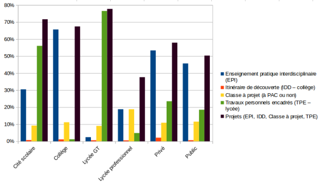 Plus globalement la démarche de projet par l'élève, dans le cadre de dispositifs institutionnalisés, est un cadre que les professeurs documentalistes intègrent, globalement, si ce n'est en lycée professionnel, en particulier public (Graphique 15). Ainsi, avec les EPI en collège, les TPE en lycée, les deux en cité scolaire, 67 à 78 % des collègues sont concernés. En lycée GT, on observe toutefois une baisse importante pour les TPE (Travaux personnels encadrés), de 10 points, à 76,5 % des répondants[4], quand c'est une baisse de 15 points en cité scolaire, à 56 % des répondants[5].