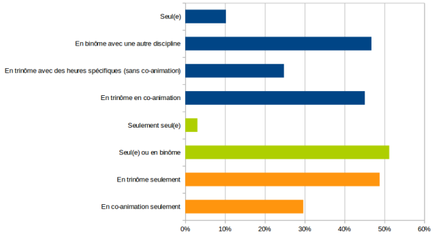 Dans le panel, 869 collègues travaillent sur les EPI, 783 en collège pour lesquels nous précisons le détail ici (Graphique 16). Il s'agit de questionner le mode d'organisation, mais aussi la capacité d'intervention. Notons déjà que, contre le principe théorique des EPI, un collègue sur dix propose un ou plusieurs EPI seul, mais souvent travaillant par ailleurs en binôme ou en trinôme sur un autre ou plusieurs EPI. La moitié des collègues travaillent seuls et/ou en binôme, tandis que l'autre moitié travaille en trinôme (voire avec trois ou quatre disciplines, précisent les collègues en commentaire). Sur la globalité, le tiers ne travaille qu'en co-animation, sans heures spécifiques donc dans l'EPI. En binôme le travail se fait notamment avec les collègues de français, d'histoire-géo, de SVT, mais aussi d'anglais.