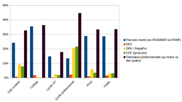 La suppression des options réduit considérablement, logiquement, l'investissement dans la découverte professionnelle, quand bien elle est toujours possible. Toutefois, 20,4 % des collègues de lycée professionnel[22] participent au module DP6 (Découverte professionnelle 6 heures), avec une forte baisse par rapport aux années précédentes, à 28,6 % dans le privé contre 19 % dans le public. Également en lycée professionnel, 21,5 % des répondants[23] sont partie prenante du CCF (Contrôle en cours de formation).