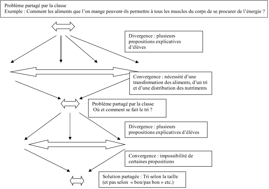 Les moments d’activités divergentes sont des moments où les élèves sont susceptibles de produire des réponses différentes (situation où l’enseignant demande aux élèves de développer leurs conceptions, ou d’élaborer un protocole expérimental, ou de se doter d’un corpus documentaire pour une mise à l’épreuve d’hypothèses, etc.). Ils mettent à l’œuvre une logique de l’imagination et d’exploration des possibles. Ils sont propices à des échanges et à des débats dans le groupe, la classe, la communauté élargie (analyse, comparaison et critique des différentes propositions) qui restreignent les possibles et, dans le déroulement d’une séquence d’enseignement, ils doivent nécessairement être suivis, à un moment ou à un autre, de situations faisant converger vers un texte commun de savoir. Remarquons qu’il ne s’agit pas de n’importe quelle convergence. Elle n’a rien à voir en effet avec un cas limite d’activité convergente, celui où la majorité des élèves produit l’attendu ou quelque chose de proche, parce que la situation ou le guidage enseignant a été en permanence très fort. C’est notamment le cas des fiches d’activités. Les élèves sont canalisés et il ne reste plus qu’à faire une vérification de ce qu’à peu près tous obtiennent. On est sur une logique du vrai et du faux.