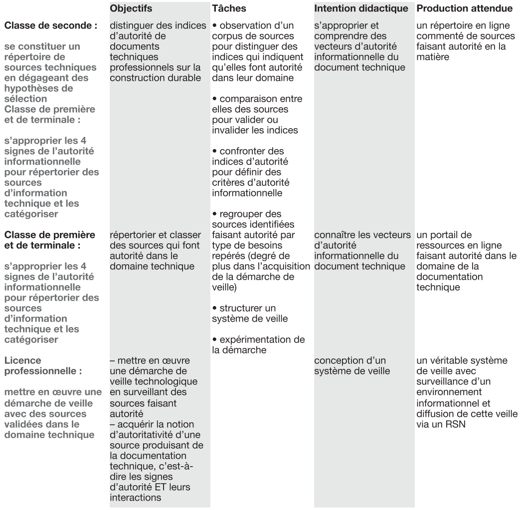 Il doit ensuite savoir ce qui fait son autorité et ce d’autant plus dans le contexte du numérique qui voit le régime auctorial traditionnel modifié. Partant de ces deux préalables, une progression des apprentissages [6] peut être envisagée pour rendre l’élève de lycée éveillé à la documentation technique à l’issue de son baccalauréat, pour ensuite maîtriser une démarche de veille technologique une fois achevé le cycle supérieur de ses études.