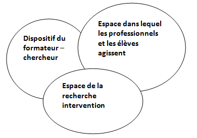 Le dispositif de formation repose sur l’élaboration par les futurs professeurs des écoles d’une situation d’apprentissage. Le dispositif de recherche se bâtit avec l’équipe de formateurs-documentalistes concernée. Il y a deux espaces d’intervention dans lesquels agissent les professionnels : IUFM/ESPE – CRD (Centre de Ressources Documentaires). Et trois espaces dans lesquels se construisent la formation, la recherche, l’analyse : IUFM/ESPE – CRD - Laboratoire de recherche.