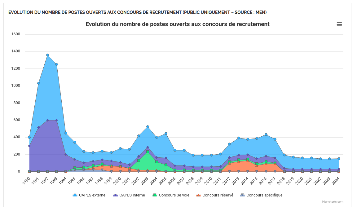 Ces fermetures dans les INSPÉ font suite à la réforme générale de la formation initiale en cours de mise en œuvre pour faire face à la crise de recrutement des enseignant·es [3]. C’est ce que rappelle le ministère dans une réponse faite en novembre 2025 au député Hadrien Clouet, porteur d’une question au gouvernement à l’Assemblée sur les conséquences de la réforme pour le CAPES Documentation : elle est « destinée à renforcer l’attractivité des concours et à mieux préparer les professeurs aux réalités de leur métier », et d’ajouter finalement « Le rôle des professeurs documentalistes dans la formation des élèves à l’information-documentation, à l’éducation aux médias et à l’information, et plus largement à l’esprit critique demeure pleinement reconnu par le ministère. » [4]. Or le CAPES Documentation ne rencontre pas les difficultés de recrutement de certaines filières en tensions.