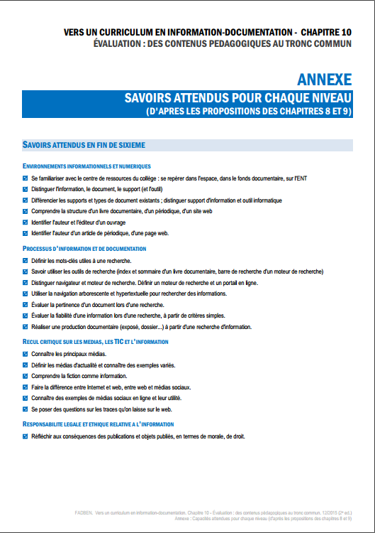 L’évaluation est un sujet complexe pour les professeurs documentalistes. Beaucoup d’entre eux écartent l’idée de la notation, ce qui peut occasionner une difficulté pour suivre la progression de chaque élève en information-documentation. Le mode d’évaluation du Socle commun de 2006 a été reçu favorablement par de nombreux collègues, pour la lisibilité qu’il donnait aux élèves, aux équipes pédagogiques et aux parents, dans le suivi de l’acquisition des connaissances et compétences. Cet outil permettait une intégration évidente des professeurs documentalistes, selon les items proposés, malgré les difficultés locales à faire reconnaître des compétences professionnelles dans le domaine pédagogique, et donc en matière d’évaluation. Parfois, il s’agit simplement de difficultés à faire apparaître le professeur documentaliste au sein du groupe de l’équipe pédagogique enregistrée dans l’outil informatique employé pour la formalisation de cette évaluation. Toutefois, construit à partir de programmes existants et axé essentiellement sur des compétences procédurales en termes d’information-documentation, ce mode d’évaluation souffre de plusieurs défauts, qui peuvent être dépassés grâce au curriculum.