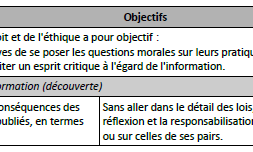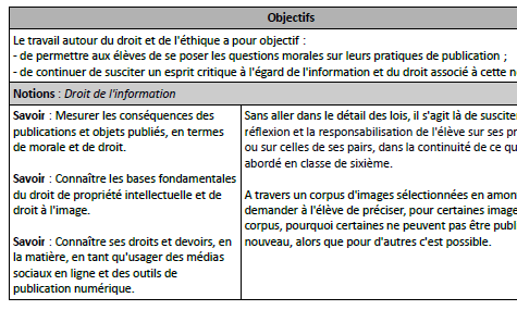 | Savoir : Réfléchir aux conséquences des publications et objets publiés, en termes de morale, de droit. | Sans aller dans le détail des lois, il s’agit là de susciter la réflexion et la responsabilisation de l’élève sur ses pratiques ou sur celles de ses pairs. |