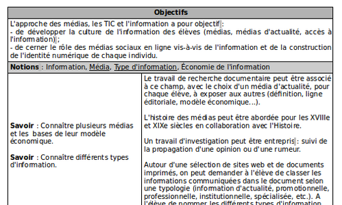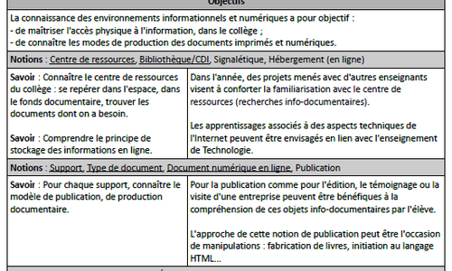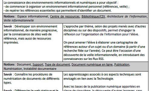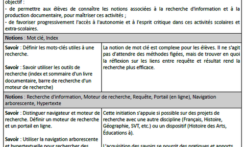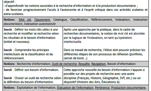 - d’approfondir les notions associées à la recherche d’information et à la production documentaire ; - de favoriser progressivement l’accès à l’autonomie et à l’esprit critique dans ces activités scolaires et extra-scolaires. | |