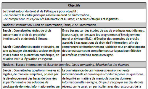 En classe de quatrième, en lien avec les programmes de l’Enseignement moral et civique (EMC) relatifs à la découverte du droit et du fonctionnement de la justice en France, les élèves acquièrent des connaissances plus précises sur le droit de l’information : droit de propriété intellectuelle, droit à l’image, avec une découverte de l’éthique de l’information, en termes de médias d’actualité, mais aussi en termes de pratiques personnelles et professionnelles.
