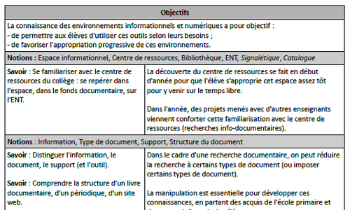 - de permettre aux élèves de connaître les notions associées à la recherche d’information et à la production documentaire, pour maîtriser ces activités ; - de favoriser progressivement l’accès à l’autonomie et à l’esprit critique dans ces activités scolaires et extra-scolaires. | |