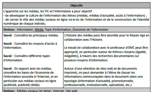 - d’approfondir le développement de la culture de l’information des élèves (médias, médias d’actualité, accès à l’information), en particulier en termes de médiatisation ; - de cerner le rôle des médias sociaux en ligne vis-à-vis de l’information et de la construction de l’identité numérique de chaque individu. | |