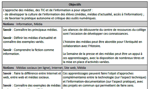 Au collège, l’approche par discipline conduit à développer des considérations spécifiques sur les médias et la culture numérique, eu égard à la notion d’information. En information-documentation, il s’agit de consolider et développer les connaissances sur la forme, puis sur l’exploitation de l’information. S’il est bien question d’approches spécifiques, il n’en est pas moins précieux de mettre en avant des approches pluridisciplinaires, afin de donner du sens à ces apprentissages.